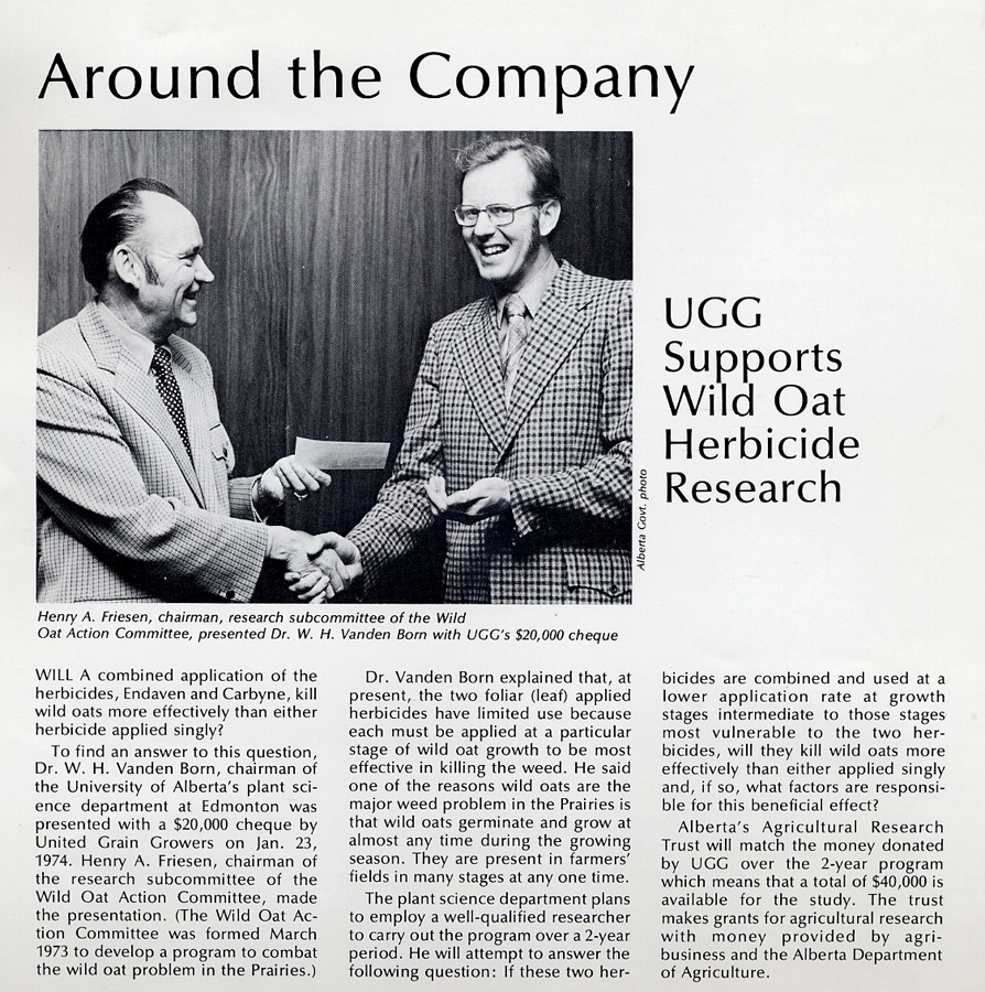 Research grant from United Grain Growers, presented by Henry Friesen 1974