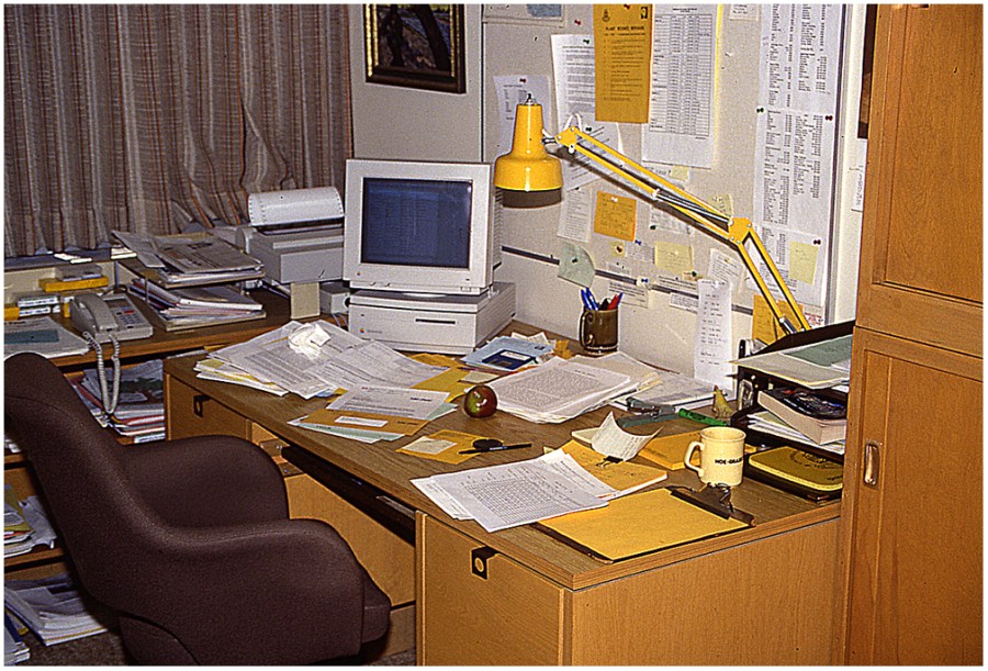 Cluttered office desk in Room 416C in 1993